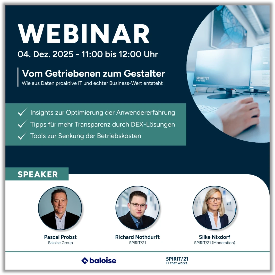 Die Versicherungsgruppe Baloise mit Hauptsitz in der Schweiz und der IT-Dienstleister SPIRIT/21 nehmen Sie mit auf eine spannende Reise – von den alltäglichen Herausforderungen bis hin zu den messbaren Erfolgen einer IT-Transformation mithilfe von Digital Experience Management (DEX).