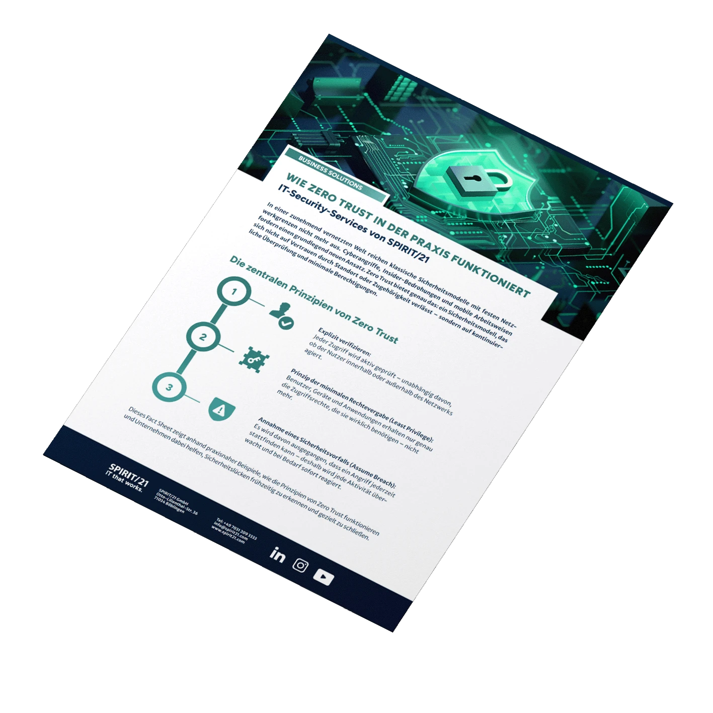 Mit unserem aktuellen Factsheet erhalten Sie einen praxisnahen Überblick über die drei Kernprinzipien von Zero Trust – „Explizit verifizieren“, „Least Privilege“ und „Assume Breach“ – und lernen konkrete Anwendungsszenarien, Technologien und Maßnahmen zur Umsetzung kennen.