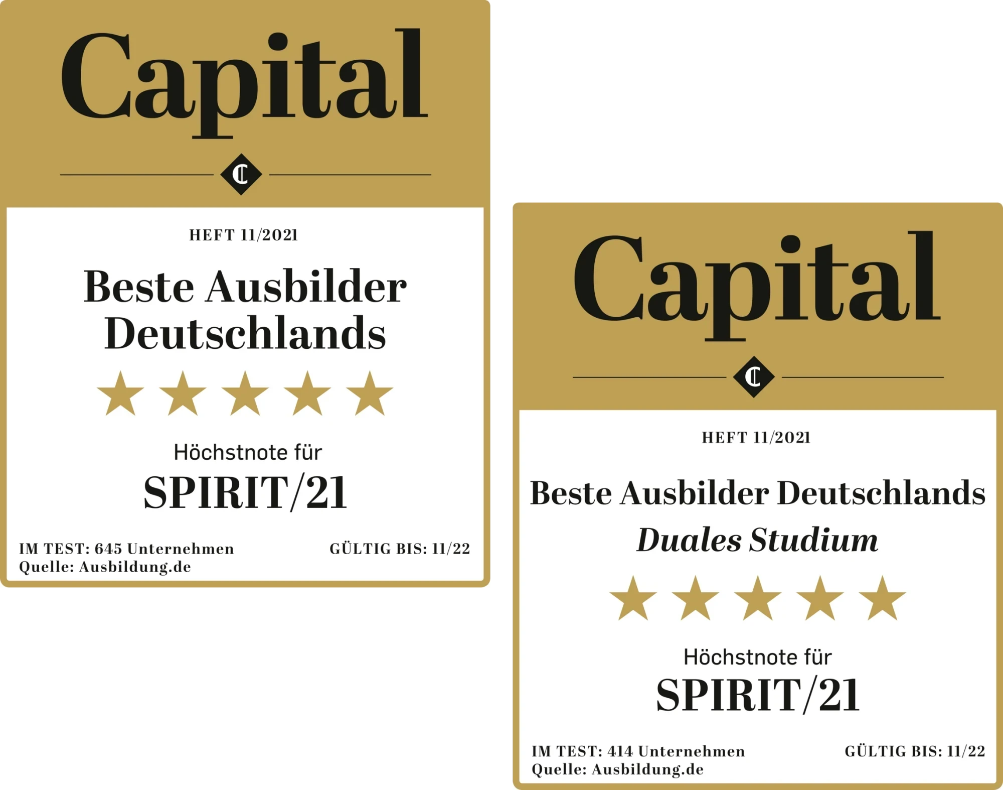 Zum siebten Mal in Folge wurde SPIRIT/21 vom Wirtschaftsmagazin Capital als „Bester Ausbilder Deutschlands“ ausgezeichnet. Auch 2023/2024 gehören wir zu den 500 besten Ausbildungsunternehmen in Deutschland.