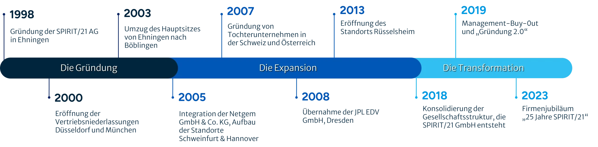 Wachstum in alle Richtungen, aber nicht um jeden Preis, dominiert die zweite Phase der Unternehmensgeschichte. SPIRIT/21 vervielfacht die Mitarbeiterzahl und eröffnet Standorte in Deutschland und im deutschsprachigen Ausland. Durch die Integration von einzelnen Fachkräften und ganzen Teams entwickelt sich nicht nur die Unternehmenskultur weiter, auch das Portfolio der angebotenen Dienstleistungen