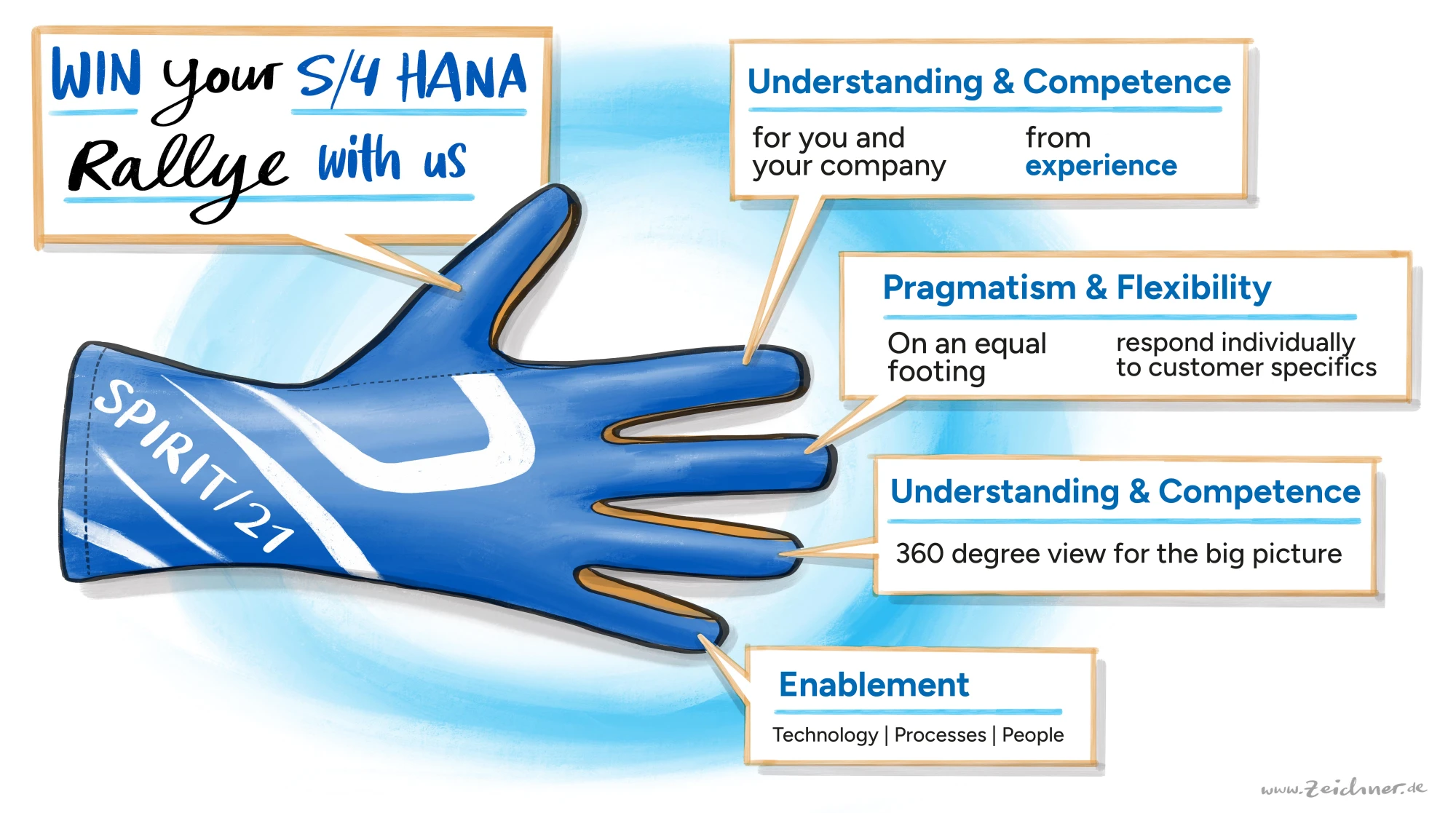 We like to compare S/4HANA transformation projects to a rally in which we want to guide you successfully to the finish line. As the driver, you have the steering wheel and the gas pedal under control - in other words, you determine the direction and speed. As co-co driver, we provide you with the right tips and our pit crew optimally prepares your vehicle for each stage. This way, we ensure that you win your personal S/4HANA rally and are your partner from training to the start to the finish.