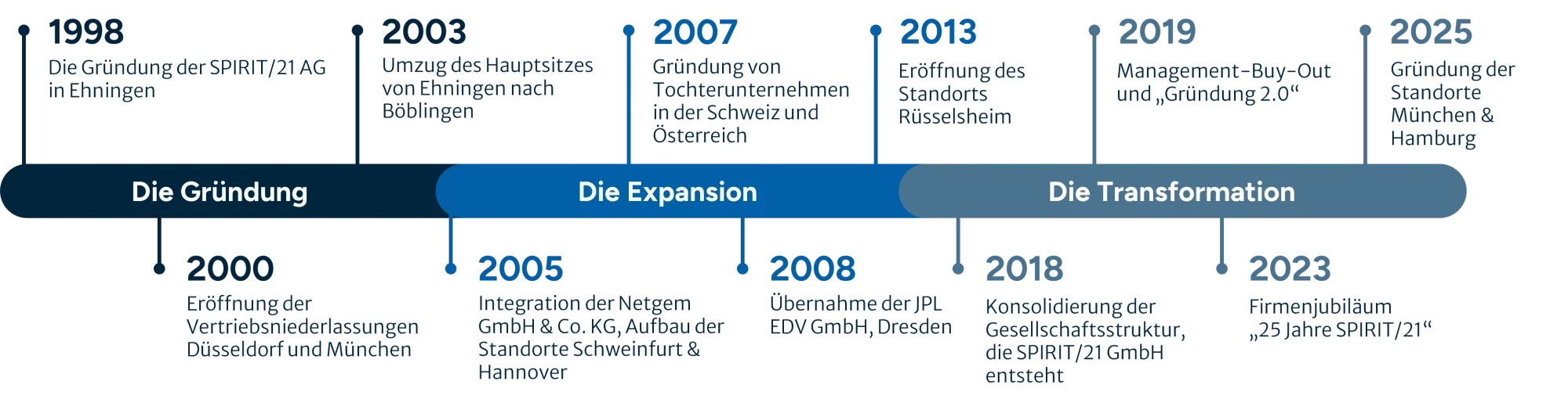 Wachstum in alle Richtungen, aber nicht um jeden Preis, dominiert die zweite Phase der Unternehmensgeschichte. SPIRIT/21 vervielfacht die Mitarbeiterzahl und eröffnet Standorte in Deutschland und im deutschsprachigen Ausland. Durch die Integration von einzelnen Fachkräften und ganzen Teams entwickelt sich nicht nur die Unternehmenskultur weiter, auch das Portfolio der angebotenen Dienstleistungen